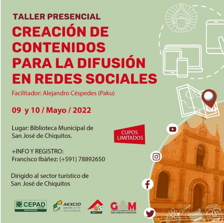 El Gobierno Autónomo Municipal de San José de Chiquitos y el Centro para la Participación y el Desarrollo Humano Sostenible (CEPAD), le invita a participar del taller de formación dirigido a emprendimientos turísticos titulado “Creación de Contenido Digital para difusión en Redes”.