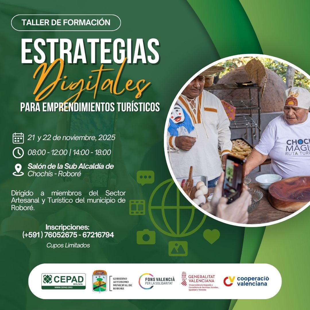 Los días 21 y 22 de noviembre, la comunidad de Chochís, en el municipio de Roboré, llevará a cabo el taller de formación “Estrategias digitales para emprendimientos turísticos”, dirigido a miembros del sector artesanal y turístico local. La actividad se realizará en las instalaciones de la Subalcaldía de Chochís y tiene como propósito fortalecer las capacidades digitales de los emprendedores de la localidad.